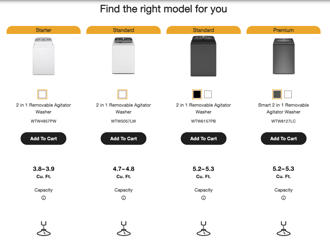 To improve the overall user experience, we created clear navigation options for users to shop or explore and learn more if they weren’t ready to buy on every page. In tandem with our data and analytics team, I created and A/B tested five value propositions to offer shoppers at checkout in order to help Whirlpool better understand the purchase behaviors of their target audience. I also developed a simplified comparison tool with consumer-facing language around pricing to help the Whirlpool brand speak to consumers about the price and features of an appliance while making it easy to navigate the brand’s product catalog and compare models.
