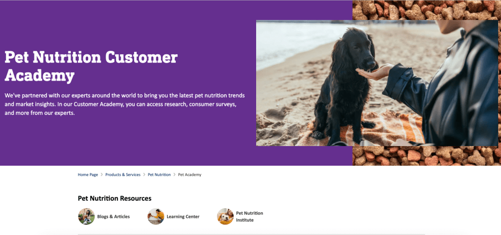 Collaborating with our digital team, I also helped write and redesign four high-level landing pages on ADM’s Pet Nutrition Customer Academy to improve their user experience and SEO value. These pages were what the awareness media campaign drove towards and house a wide range of preexisting assets ADM’s pet nutrition team had developed.
